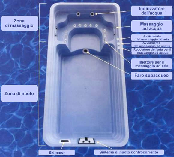 di nuoto controcorrente, poi il sistema di massaggio, i fari subacquei ecc.